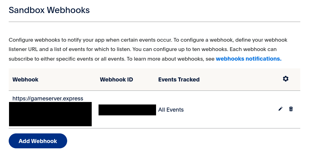 Ausschnitt ‘Webhooks’ aus dem Paypal Developer Dashboard (Sandbox modus)